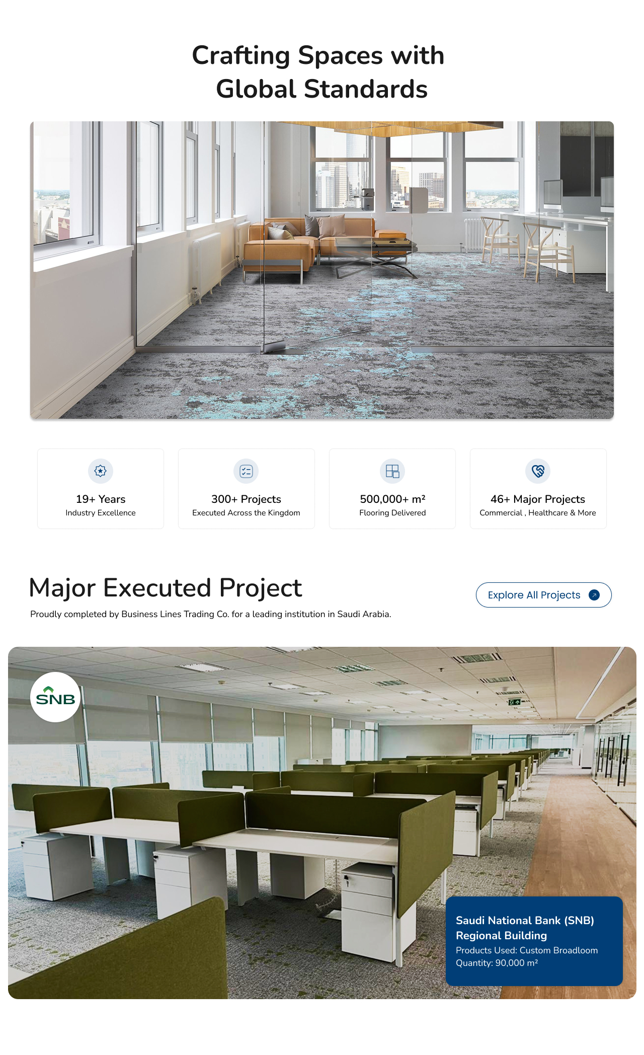 Corporate website highlighting major flooring projects across Saudi Arabia, with a modern responsive design and professional B2B branding.